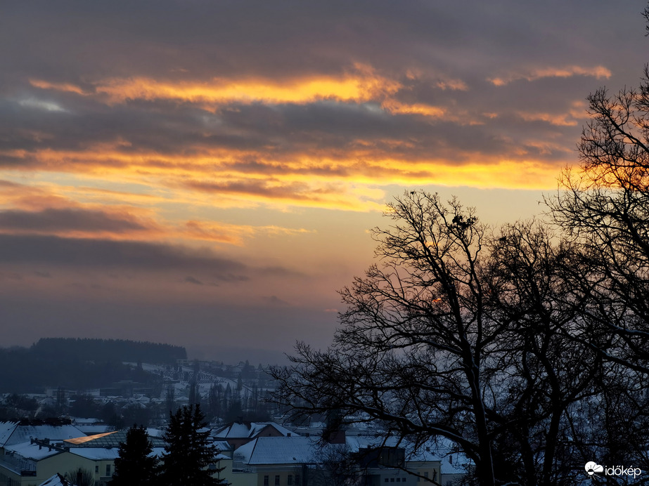 Mai párás-ködös alkonyi égbolt